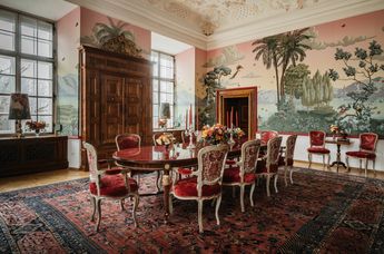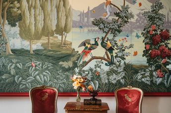Die DeGournay-Wandbespannung zeigt eine fantastische Szene aus den Tropen mit Flora und Fauna, die direkt von der verlorenen Kulisse entlehnt ist, sowie die restaurierten Stuckarbeiten an der ursprünglichen Decke des Raums. Ein iranischer Kirman-Teppich, den Traina aus dem Auktionshaus Dorotheum erworben hat, bildet den Mittelpunkt des Raumes, in dem die Gäste des Salzburg Global Seminar willkommen geheißen werden. Ein französischer Kirschtisch im Louis XVI-Stil von Salda1870 wird von den vorhandenen Rohrstühlen ergänzt, die mit Stoffen der historischen Textilunternehmen Rubelli und Pierre Frey neu gepolstert wurden.