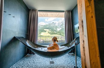 Highlight der Suiten ist die in jeder Hinsicht außergewöhnliche Hängematten-Badewanne aus Karbon, die von einer Spezialmanufaktur in Großbritannien gefertigt wird. In Europa gibt es von denen derzeit nur 7 Exemplare: in Showrooms in Frankreich, Luxemburg und Belgien bzw. in Hotels in Italien, den Niederlanden und Schweden – und jetzt bei Familie Herbst in Leogang!