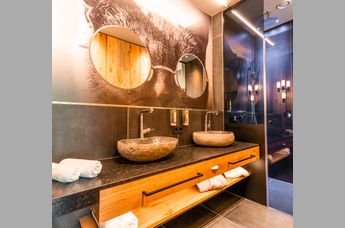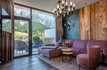 Entstanden sind dabei im Genießerhotel Die Riederalm 4*s in Leogang/Salzburger Land aber aus baulichen Gründen außerdem zwei außergewöhnliche Luxury Spa Penthouse-Suiten: Auf einer Fläche von rund 61 m² erwartet die Gäste nun feinste Wohnkultur mit lässig-modernem Alpin-Design aus hochwertigsten Materialien wie Altholz und anthrazitfarbenen Edelfliesen und mit Weinklimaschrank, eigener Sauna, und dank bodentiefer Panoramafenster ein fantastischer Blick auf die Leoganger Bergwelt mit dem markanten Birnhorn. Aufgrund der zackigen Gipfeltürme wird dieses Ensemble auch gerne als „Pinzgauer Dolomiten“ bezeichnet. Die große, südseitig ausgerichtete Dachterrasse unterstreicht das Wohnerlebnis.