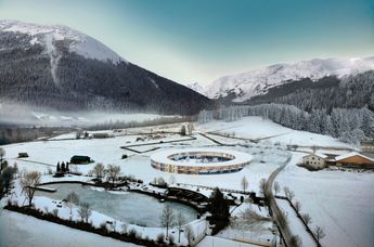 Der 60 m durchmessende Innenkreis des Apart-Hotels ist entsprechend dem Eco-Gedanken als wilder Relaxgarten mit Naturbadeteich konzipiert. Dank des eigenen Stroms kann ruhigen Gewissens auch im ganzjährig beheizten, mehr als 25 m langen Sportbecken gebadet werden, das sich von den Indoor-Sauna- und Relaxräumen ins Freie erstreckt.