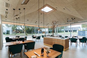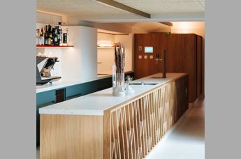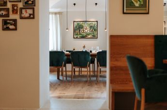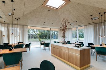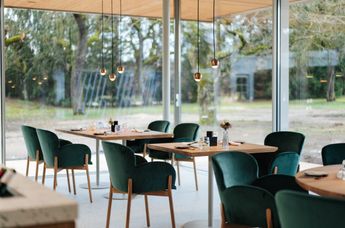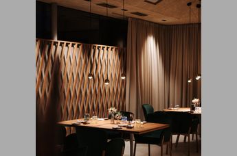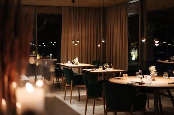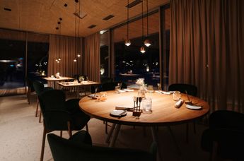 Maximal 25 Gäste sind Garant für eine wohltuend private Atmosphäre, im Separee wird für kleine Gesellschaften bis 14 Personen eine Tafel eingestellt. Das Grün der Umgebung bestimmt auch das Interieur in Kombination mit Messing und heimischer Eiche. Nachhaltigkeit bringt der traditionelle Terrazzoboden (also recycelter Glasbruch und weißer Naturstein) zum Ausdruck. Höchste Bequemlichkeit ist bei den Stühlen von TON angesagt, der frischen, jungen Marke von Thonet, während alle übrigen Holzelemente von heimischen Tischlern maßgefertigt sind.