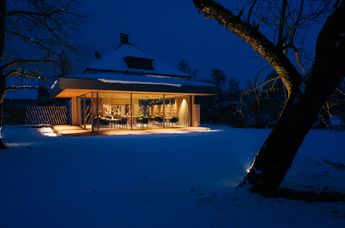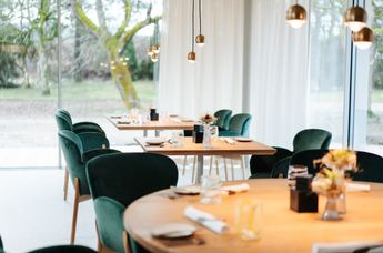 Lichtdurchflutet öffnet sich das neue Restaurant zum Garten, der schon immer ein natürliches Markenzeichen des Lokals war. Die großen Schiebefenster lassen sich vollständig öffnen und vermitteln ganzjährig das Gefühl, mitten im Grünen Platz zu nehmen und die Natur zu genießen.