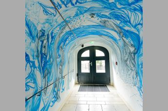 Der Verbindungsgang beider Räume wurde schließlich selbst zum Kunstwerk: Christian Schwarzwald, in Salzburg geborener Künstler, der an der Akademie für bildende Künste Wien lehrt, brachte blaue Farbe als überdimensionale Grafik mittels Airbrush an die Wand. „Das hat bis heute eine Wirkung auf die Menschen“, erzählt Andreas Gfrerer. „Der Durchgang ist seitdem der wohl meistfotografierte Raum des Hauses! Er ist ein großer Schritt weiter zu meinem Ziel, dass die Blaue Gans ein wahre Wunderkammer wird.“