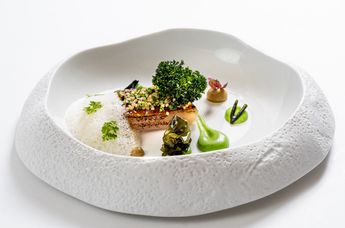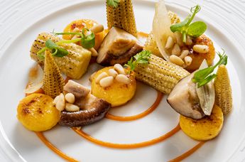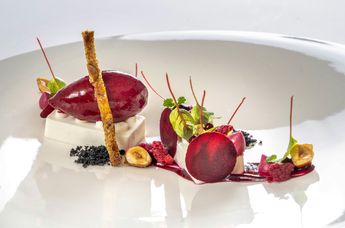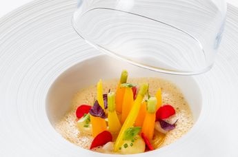 "Für uns ist es selbstverständlich, auch an die Vegetarier zu denken", sagt der Küchenchef, der bereits in Zwei-Sterne-Häusern wie dem Miramar in Katalonien gearbeitet hat. Und kredenzt ihnen ein opulentes Menü. Zum Auftakt serviert er zum Beispiel feine Rote Bete mit Himbeere, Ziegenkäse und Ponzu, der würzigen Zitrus-Sauce. Es folgen eine Auberginen-Pastete mit Wakame, Quinoa und Grünkohl, um dann mit kleinen Karotten samt Tamarinde, Curry und Zitronengras den Gaumen zu erfreuen. Danach duftet Baby-Mais mit Polenta, Süßkartoffel und Mirin-Zwiebeln auf den Tellern, bevor die Mandel-Miso-Praline mit Karamell, Aprikose und Vanille den süßen Abschluss bildet.