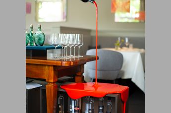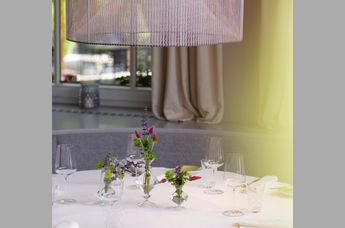 Besonders angetan haben es Susanne Dorfer-Bacher und ihrem Mann Thomas Dorfer die Gespinste von dem Vorarlberger Künstler Nikolaus Gohm. Dabei wird ein zylindrisches Metallgerüst mit farbigen Fäden in einer bestimmten Ordnung fest umspannt, wodurch die Form eines Hyperboloids entsteht. Da die Gespinste keine Leuchtmittel haben, waren die von achtsamer Hand platzierten Lichtquellen von großer Bedeutung. „Sie sind einzigartig und geben dem Raum das besondere Etwas, deswegen haben wir alles rundherum dezent gehalten“, so das Paar. Eine scheinbar schwebende Weinflasche des oberösterreichischen Künstlers Markus Hofer stellt als Kunstobjekt die Verbindung zum Wein, der schon immer einen wichtigen Stellenwert im Landhaus Bacher hatte, her. „Es handelt sich um einen Wein des Lieblings-Châteaus von meinem Vater mit meinem Jahrgang“, so die Sommelière Susanne Dorfer-Bacher.