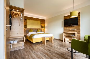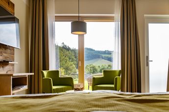 Die neuen Zimmer wurden ausschließlich von regionalen Betrieben errichtet und haben eine Größe von 26 m2 samt einer Sitzgelegenheit im Freien mit Blick in die Natur und Aussicht auf Bad Schönau. Gestaltet in violett, in hellem Grün und sanften Rot-Tönen, ausgestattet mit Altholz und behaglichen Stoffen, erfreuen sie die Gäste mit viel Tageslicht. Umgeben von Feldern und Wiesen, ist jeder Morgen ein Naturschauspiel – mit etwas Glück von einem Reh, einem Fasan oder ein paar Vögeln begleitet.